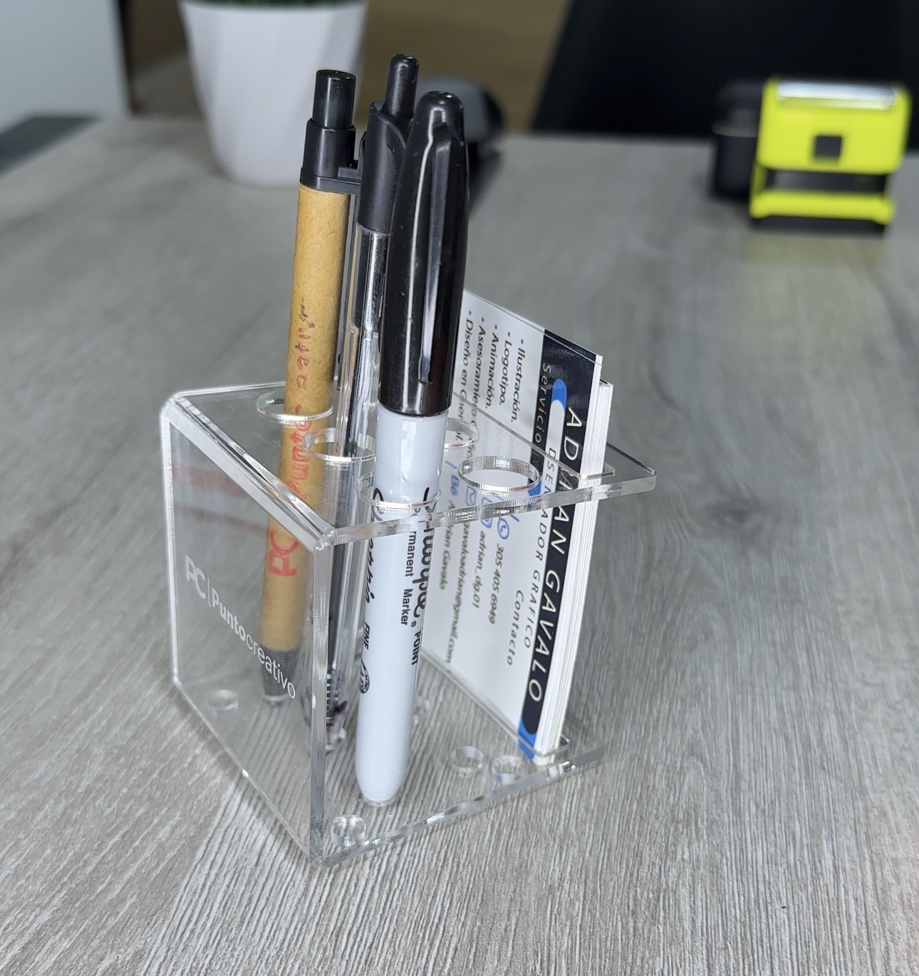 Este práctico organizador porta bolígrafos está elaborado en acrílico transparente, ofreciendo un diseño moderno, minimalista y elegante que se adapta fácilmente a cualquier escritorio u oficina.
